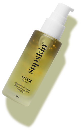 Elixir blends the best of nature and science with Grapeseed, Squalane, and 24K Gold Flakes to transform your skin into a radiant masterpiece.